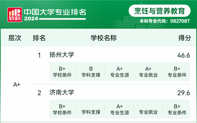 烹饪与营养教育专业成功上榜A+专业,位列全国第二名。