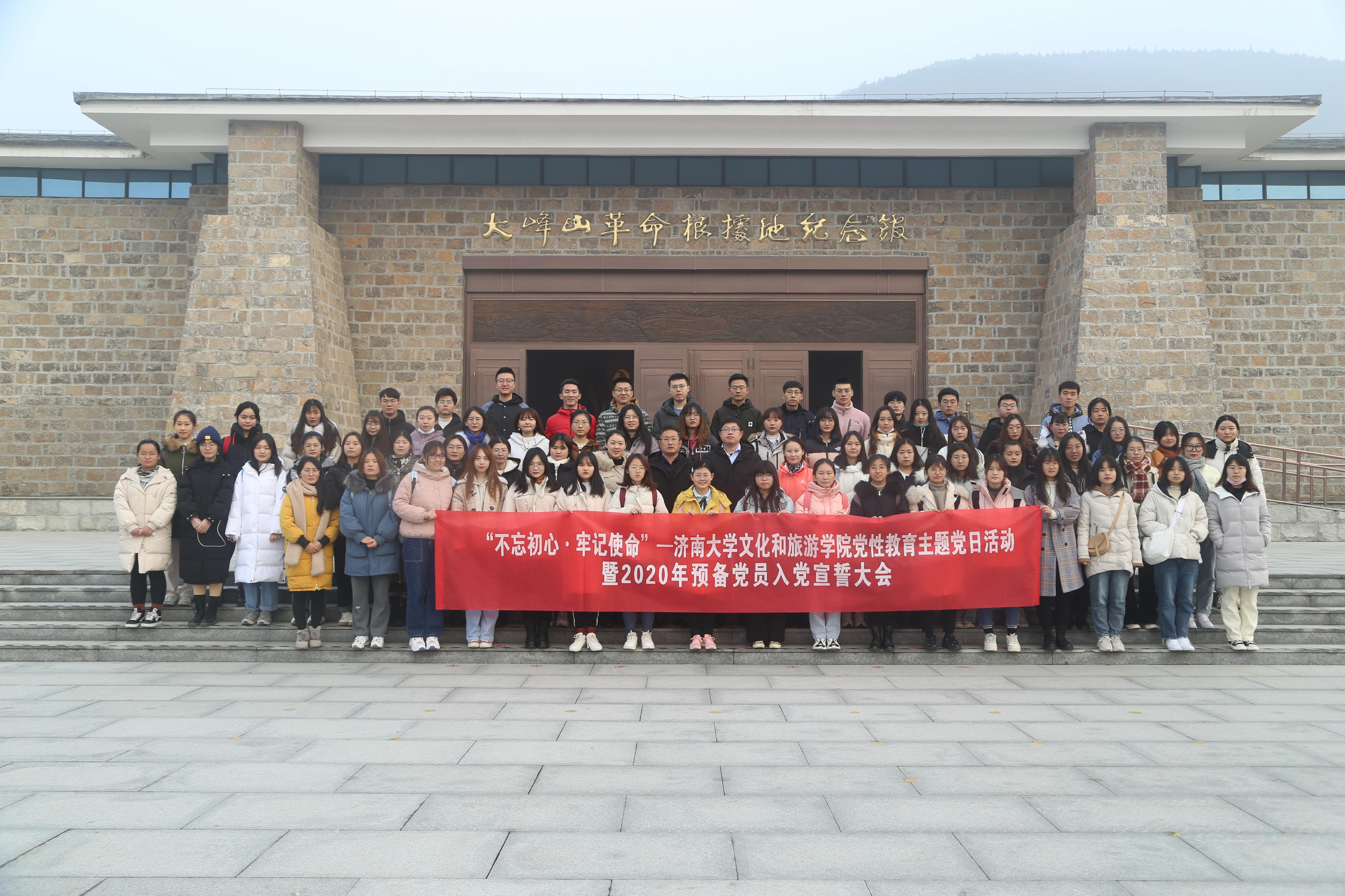 党性主题教育暨2020年预备党员入党宣誓大会在长清区大峰山党性教育基地举行,学院67名预备党员、教师党员代表参加大会。