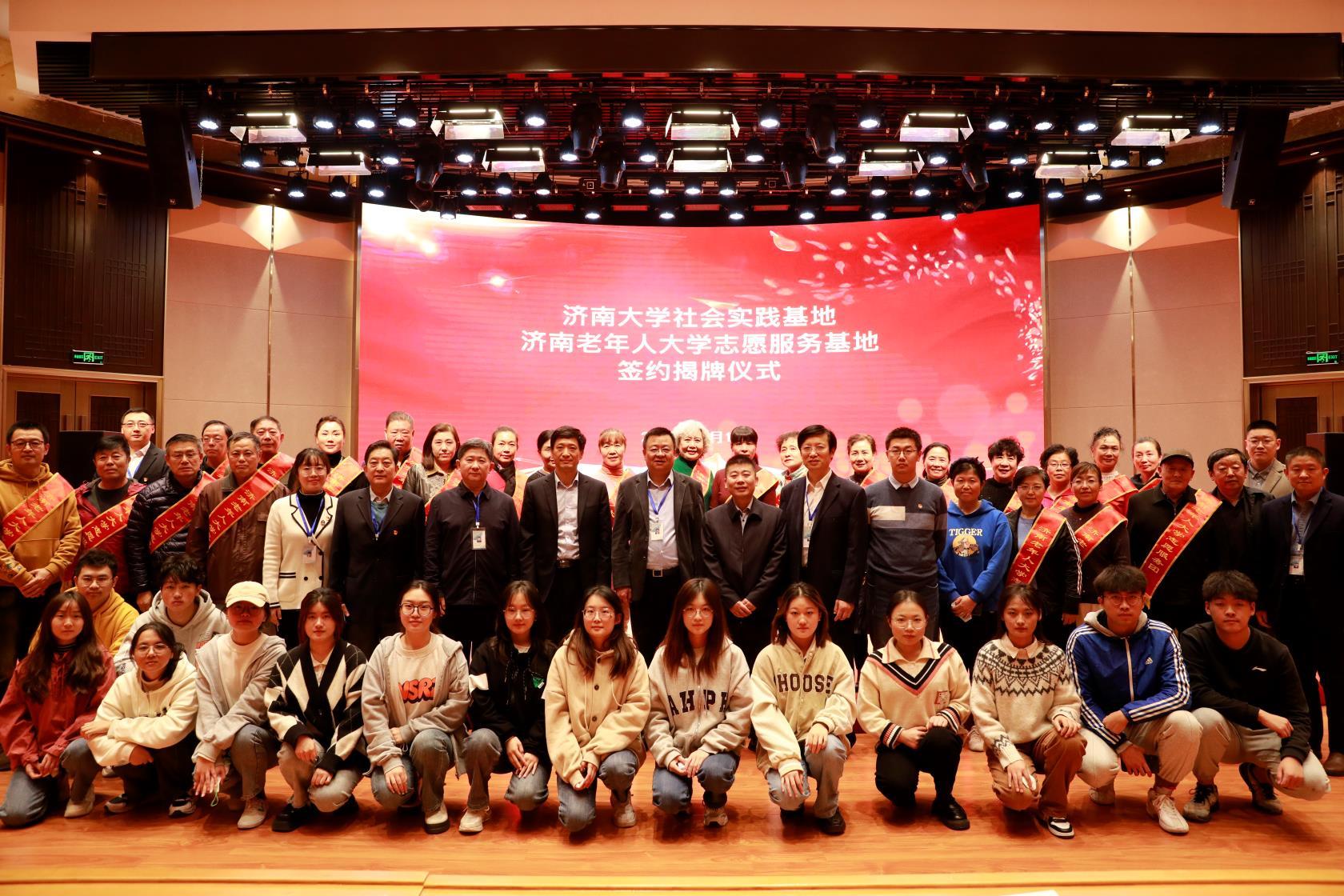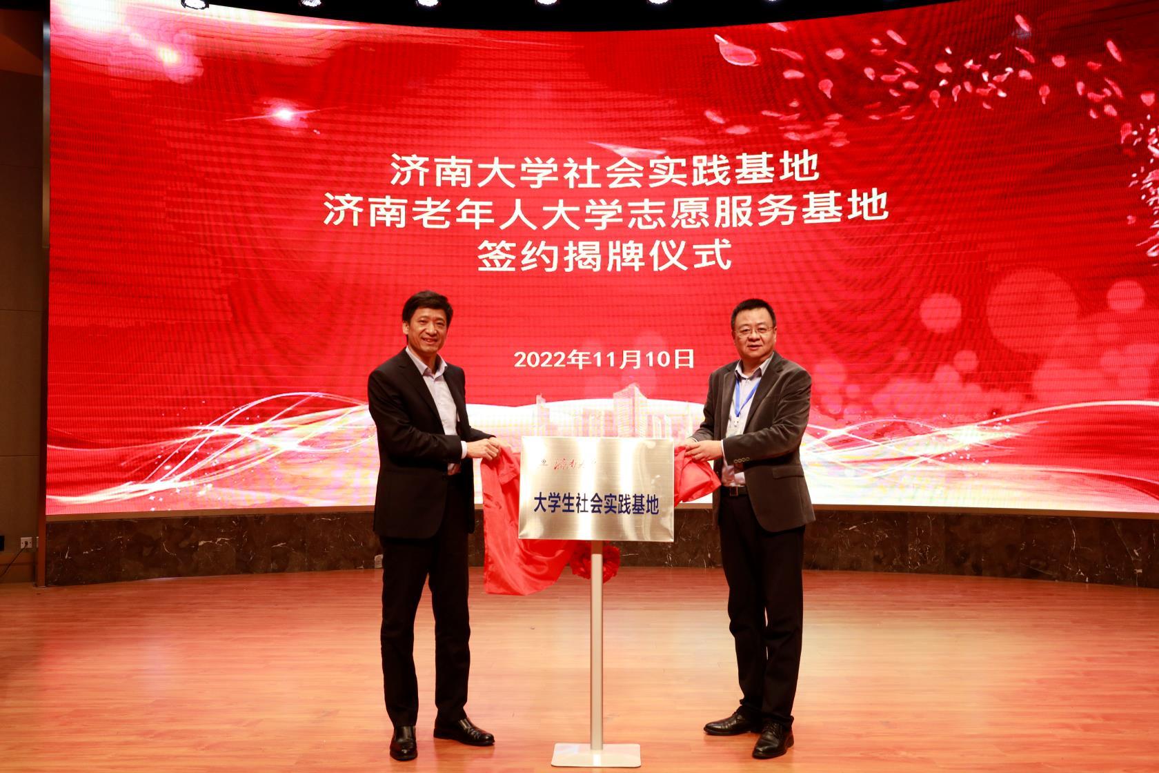 仪式上,双方签订了合作共建协议书。王磊、李晓钟共同为“济南老年人大学志愿服务基地”揭牌,孟德洋、温洪军共同为“济南大学大学生社会实践基地揭牌”。