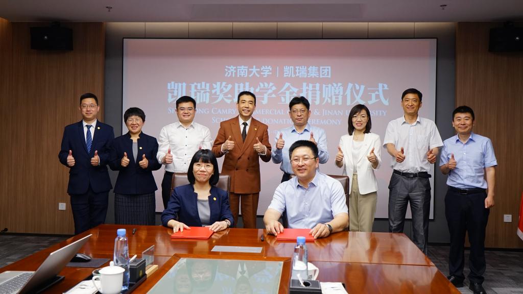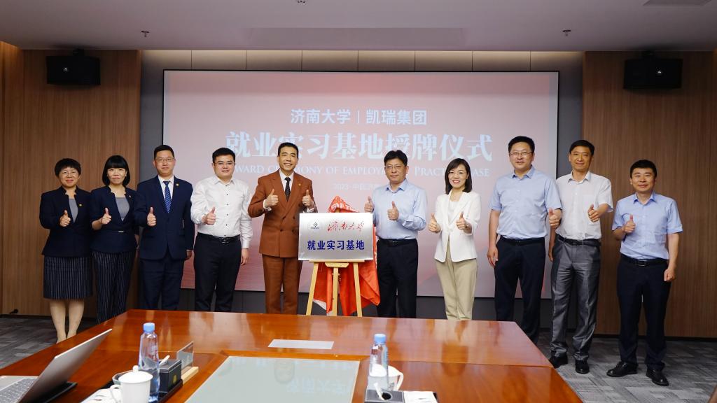 仪式上,学校合作发展处处长、教育发展基金会秘书长卢旺与凯瑞商业集团人力资源中心总监胡嘉签署教育发展基金捐赠协议。杨景波与赵孝国共同为济南大学就业实习基地揭牌。