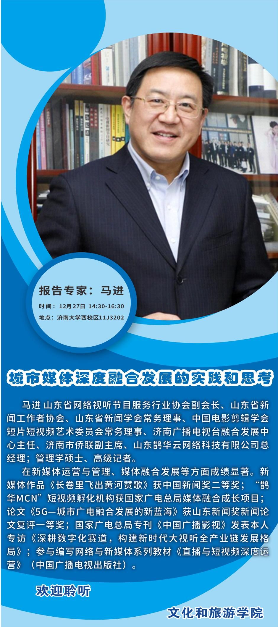 邀请山东省网络视听节目服务行业协会副会长、济南广播电视台融合发展中心主任、山东鹊华云网络科技有限公司总经理马进开展了关于《城市媒体深度融合发展的实践和思考》的专家讲座,会议由副院长马修伦主持,文化经营管理系师生共计100余人参加讲座。