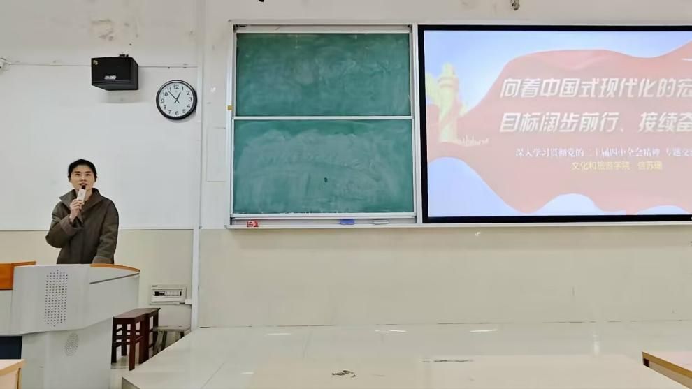 在交流研讨环节,学员们结合自身专业背景与学习体会踊跃发言。文化产业管理专业祝庆容谈到,四中全会关于文化创新的重要论述为专业学习提供了方向指引,未来将在文创设计与文化传播实践中深入挖掘中华优秀传统文化内涵,推动创意成果转化落地;旅游管理专业司雪倩表示,本次学习进一步明确了个人职业规划,今后将主动学习智慧旅游、绿色旅游等新领域知识,在实践锻炼中提升服务社会的能力。