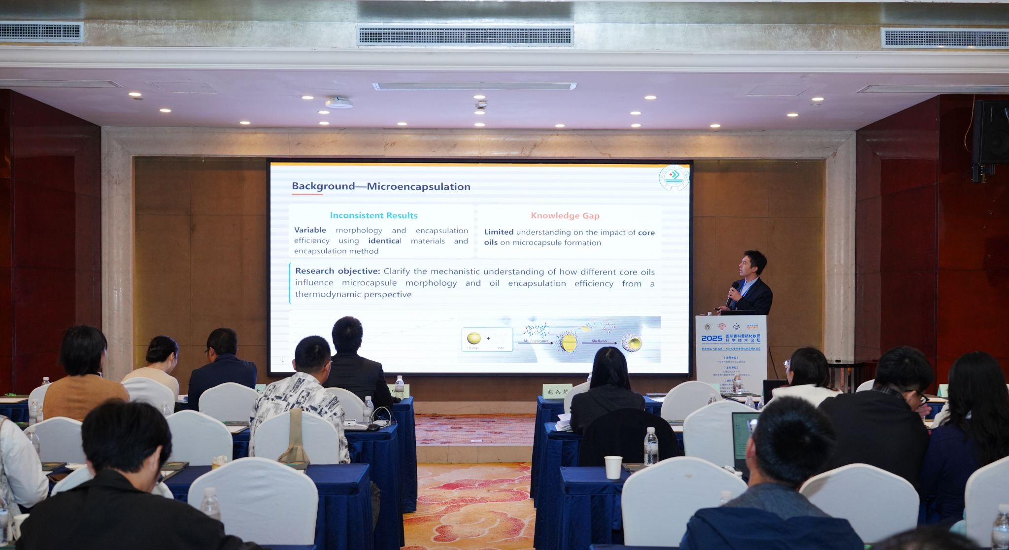黄群博士应邀参加会议并做学术报告,与参会专家就香精香料创新开发、前沿科技应用及其产业应用创新等工作进行了深入交流研讨。黄群博士在报告中汇报了复合凝聚法制备的明胶/阿拉伯胶体系中,香精油脂芯材对微胶囊形态及包封率的影响。基于铺展系数与双组分表面能计算理论的形态预测,通过扫描电镜实验观测及包封率测定得到验证。关键发现了包封率与油脂表面极性呈负相关关系。研究证实,热力学理论与芯材油脂分子极性相结合,可为设计高效包埋体系提供可靠框架,进而实现对微胶囊功能的靶向调控,以满足工业需求。