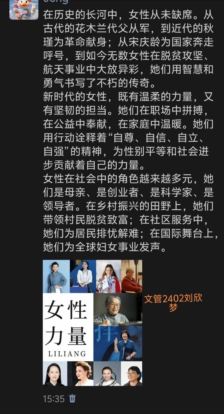 此次活动充分利用社交媒体互动性强、传播范围广的特点,鼓励全体学生在朋友圈、QQ空间、微博、短视频平台等渠道,发布鼓舞、赞誉女性的原创图文。同学们积极响应,深挖女性在历史演进、社会进步、科技创新等不同领域的卓越成就,从古代的巾帼英雄到当今的科研先锋,用青年特有的视角与表达方式,展现“她力量”的熠熠光辉。