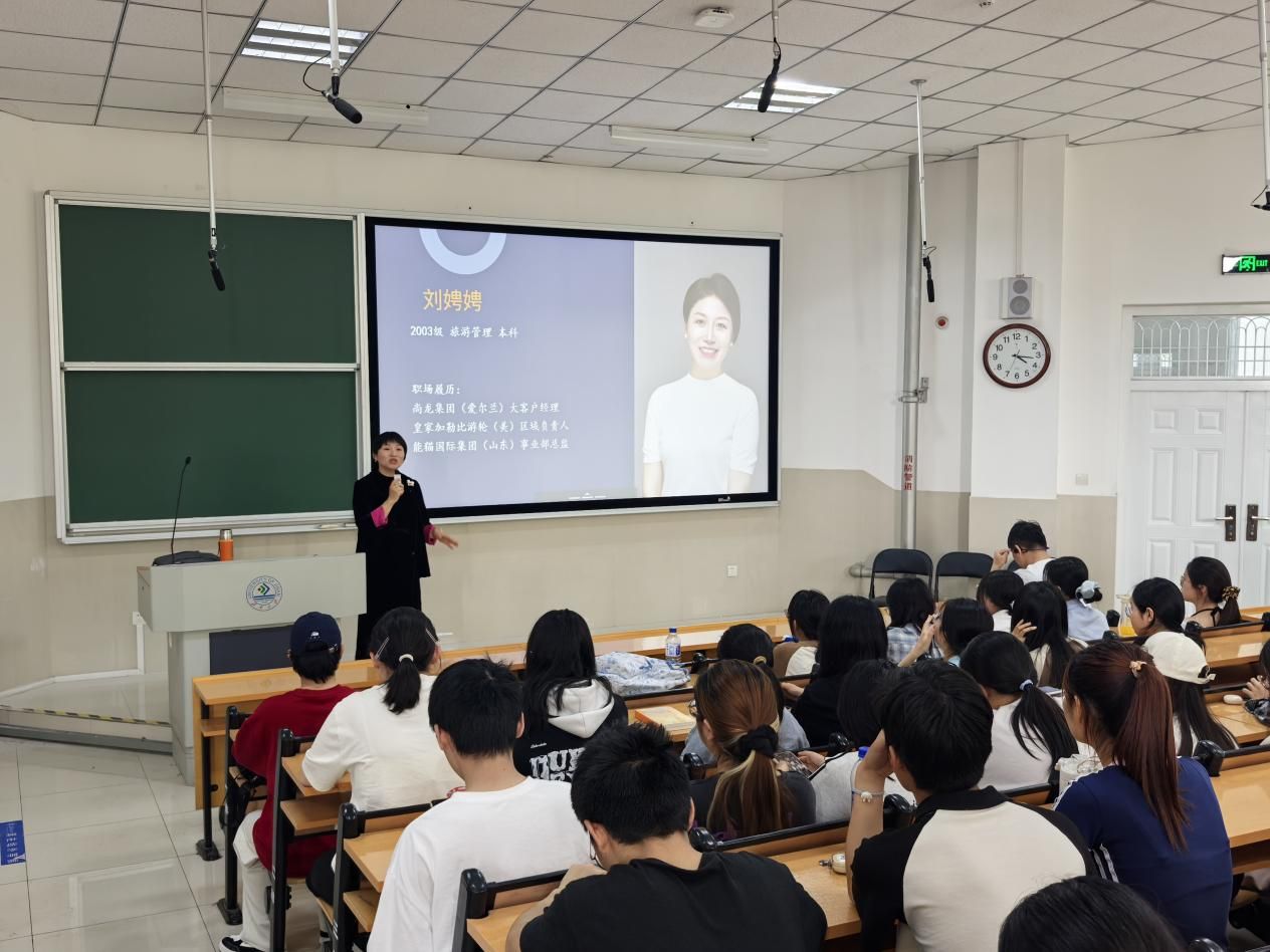 于4月23日成功举办"校友面对面——大学生职业规划与求职技巧"专题讲座。活动邀请到2003级旅游管理专业优秀校友、能猫国际集团(山东)事业部总监刘娉娉担任主讲嘉宾,学院党委副书记信苏珊出席活动并讲话。学生代表100余人参加了本次活动。