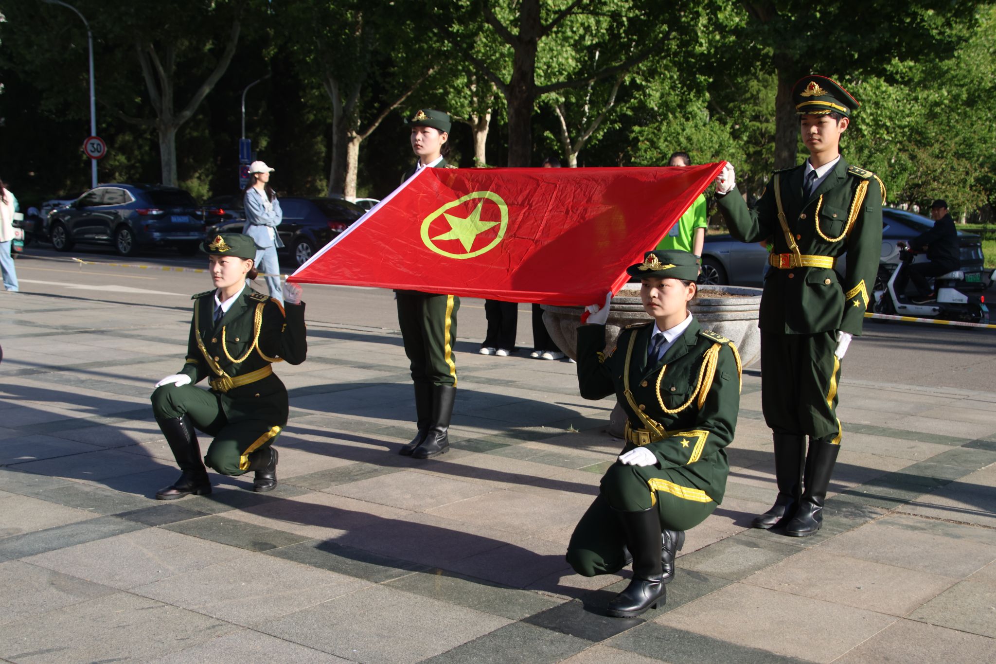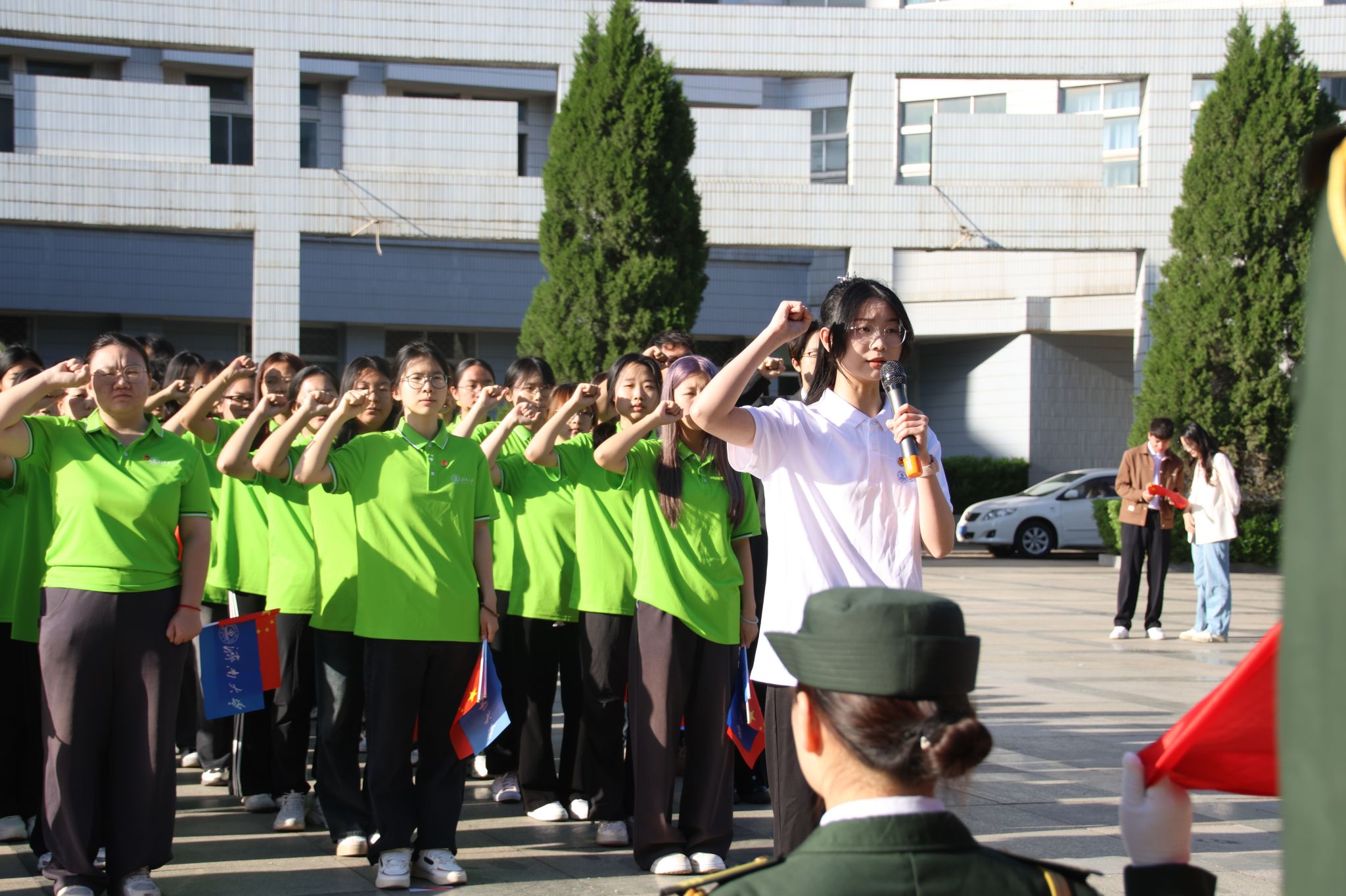 “齐步——走!”一声铿锵口令划破晨霭,国旗护卫队踏着整齐的步伐,护送五星红旗走向升旗台。全体师生肃立凝望,国歌奏响的瞬间,鲜红的旗帜迎着朝阳冉冉升起,与青年胸前的团徽、眼中的光芒交相辉映,红旗于蓝天中飞扬,这抹红是跨越百年的精神火炬!