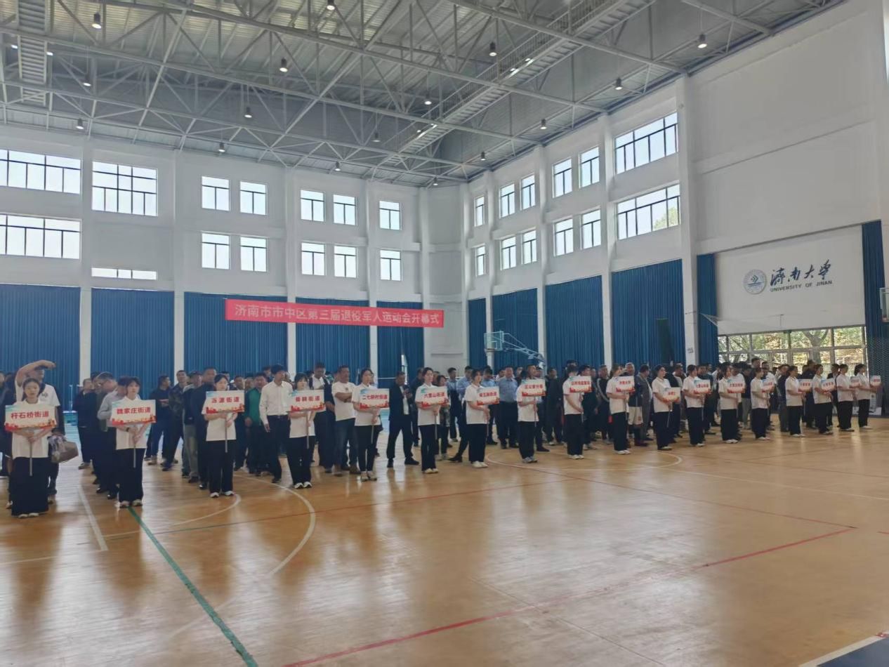 4月28日,由济南市市中区退役军人事务局主办的第三届退役军人运动会暨篮球比赛在济南大学舜耕校区体育馆开幕,各街道均派出代表队参与本次开幕式。志愿者手持街道标识牌,引导各队列入场站位。在开幕式中,退役军人们观看了济南大学风暴军团和翼虎军团的社员带来的擒敌拳和倒功表演。一位退役老兵感叹道:“这些孩子动作里的精气神,有我们当年的劲头。”参与本次开幕式的志愿者黄艺琛在采访时说道:“通过参与本次志愿服务活动,我直观的认识到‘退役不褪色’绝非一句空洞的口号,而是每一位退役军人内心深处的铮铮誓言,在以后的学习生活当中,我要严格规范自己的言行,用实际行动向他们看齐。”