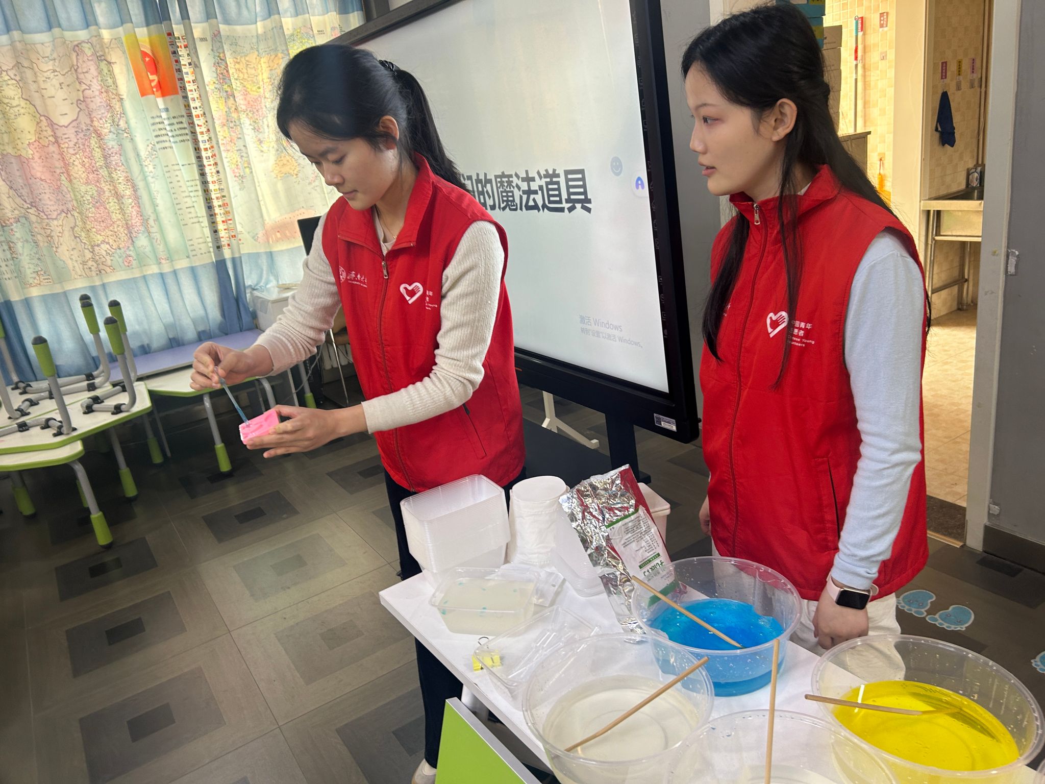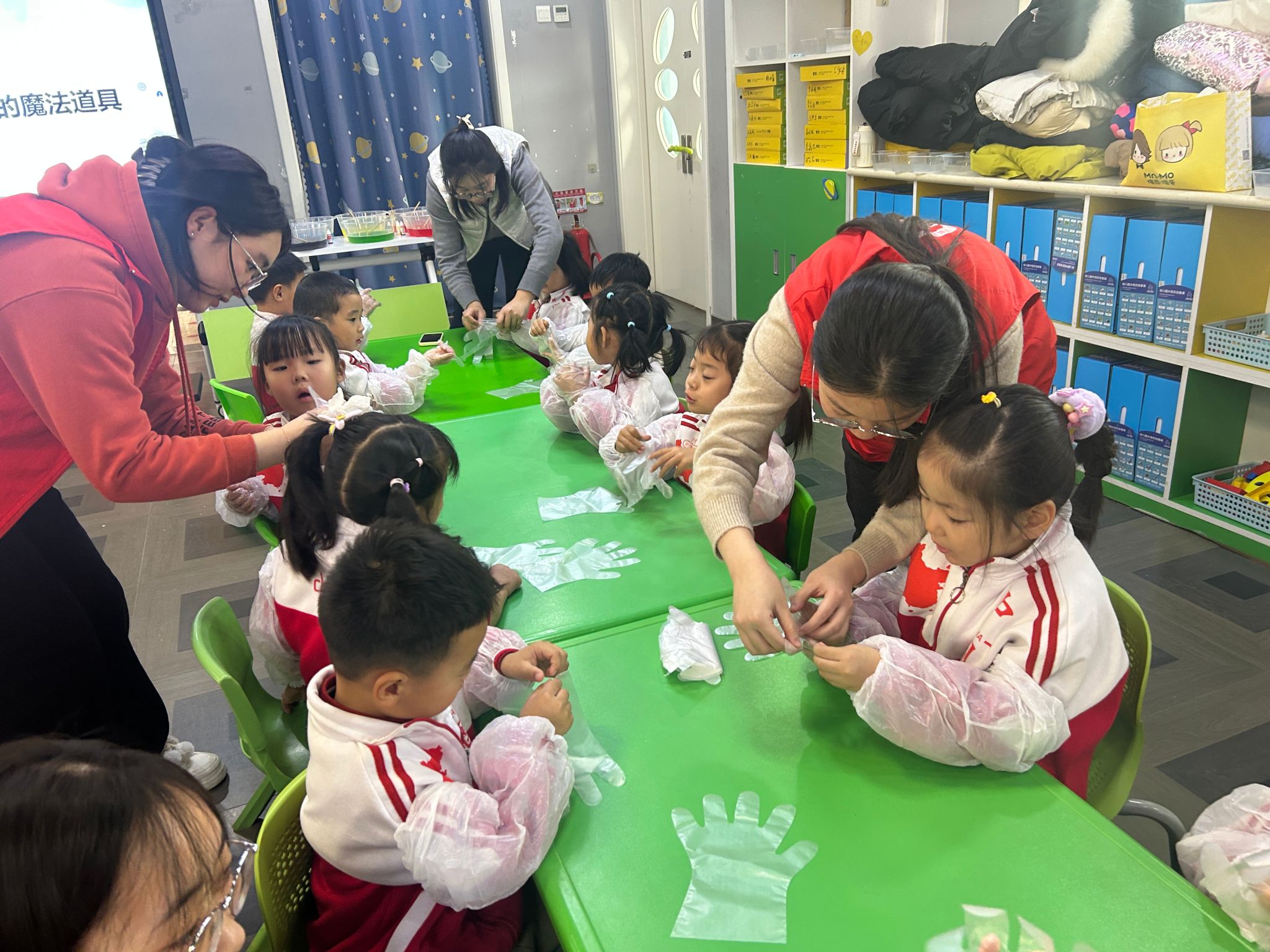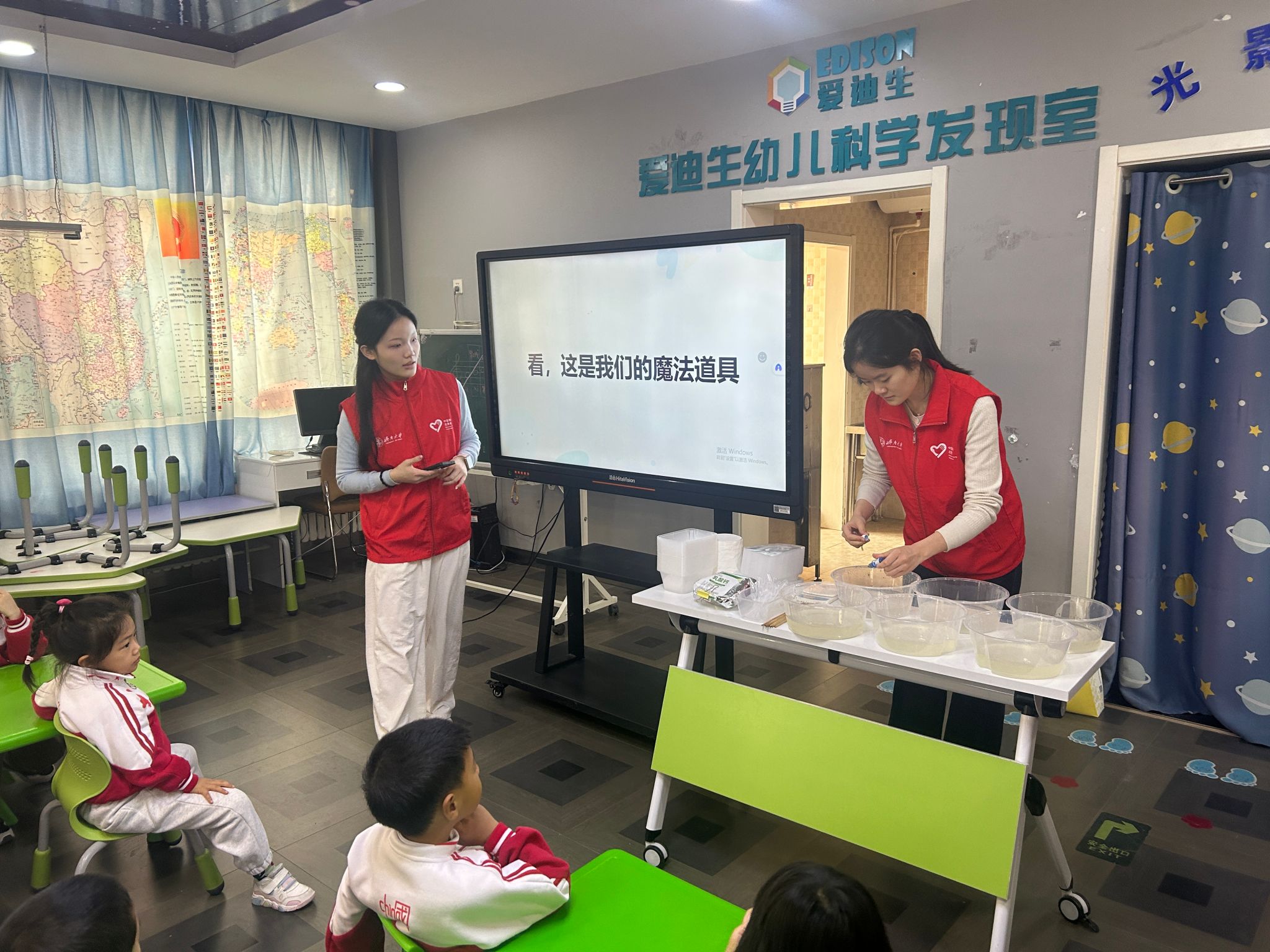活动全程,志愿者们始终将安全置于首位。所有实验材料均选用食品级原料,且反复强调“不可食用”的原则,师生配比也严格遵循安全标准,确保孩子们能安心探索。烹饪与营养教育专业的志愿者们,将专业课堂中的分子料理知识拆解为幼儿可感知、可操作的实验步骤,让原本抽象的化学反应,变成了看得见、摸得着的趣味体验。