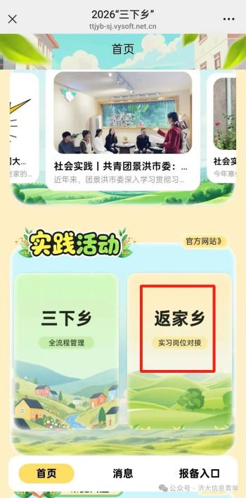 2.点击公众号底部“社会实践”,选择“2026三下乡”选项。