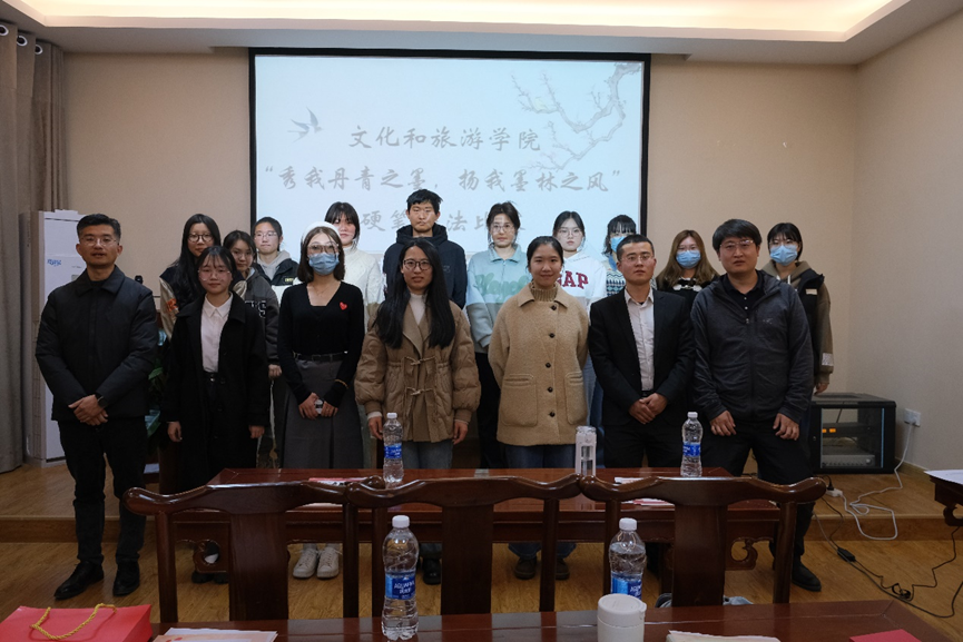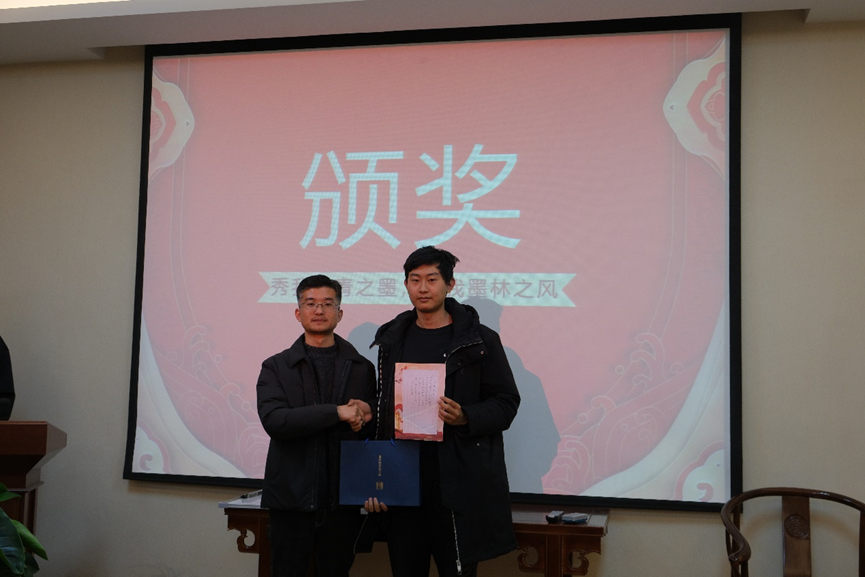 吴鲁锋老师和杨萍老师对此次活动进行了总结讲评。吴鲁锋老师从六艺讲起,提出应该重视书法书写。杨萍老师则赞扬了此次活动的比赛形式,鼓励大家潜心研究书写、重视书写。最后,评委为选手颁奖,选手们与评委进行合影留念。