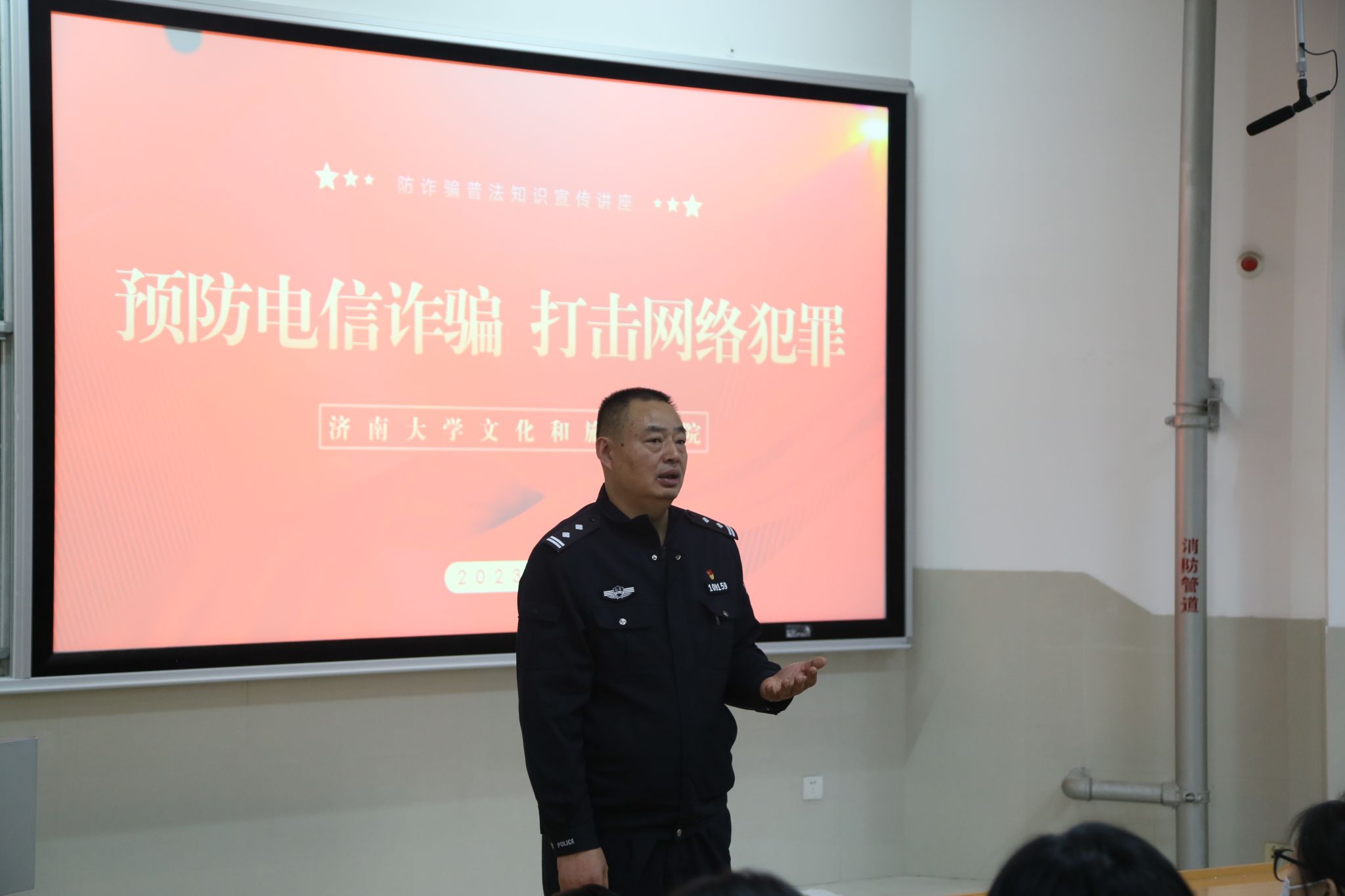 为提升学生反诈意识、增强反诈能力,切实做好安全教育,进一步筑牢学院安全屏障。12月5日下午,学院联合我校保卫处,邀请济南市公安局舜玉路派出所在舜耕校区三教201教室开展了防范电信诈骗宣传讲座。济南市公安局舜玉路派出所副所长孙全修警官、学校保卫处舜耕校区保卫科科长张韶春、学办部分老师及200余学生参加此次活动。讲座由学办老师王明扬主持。