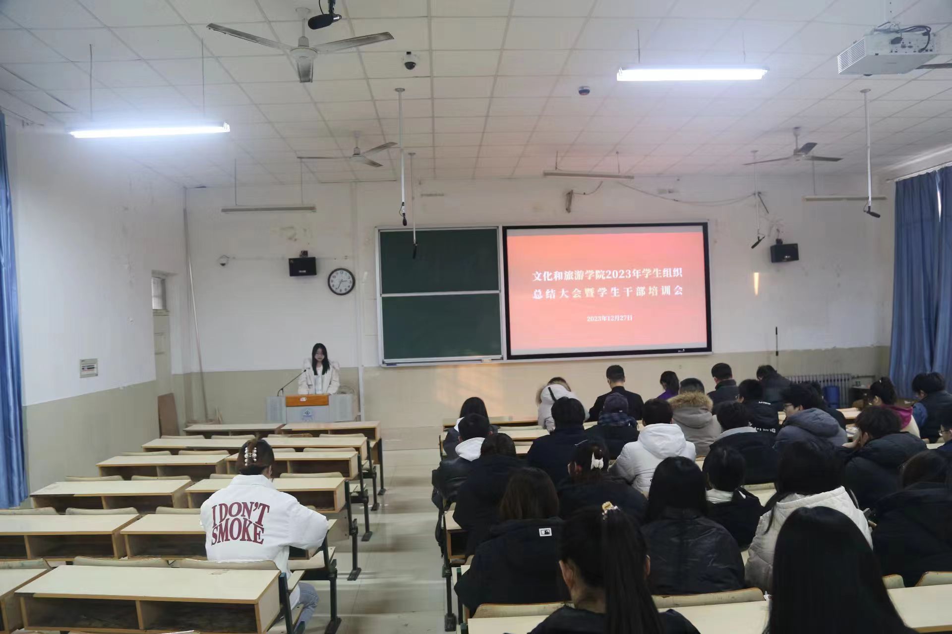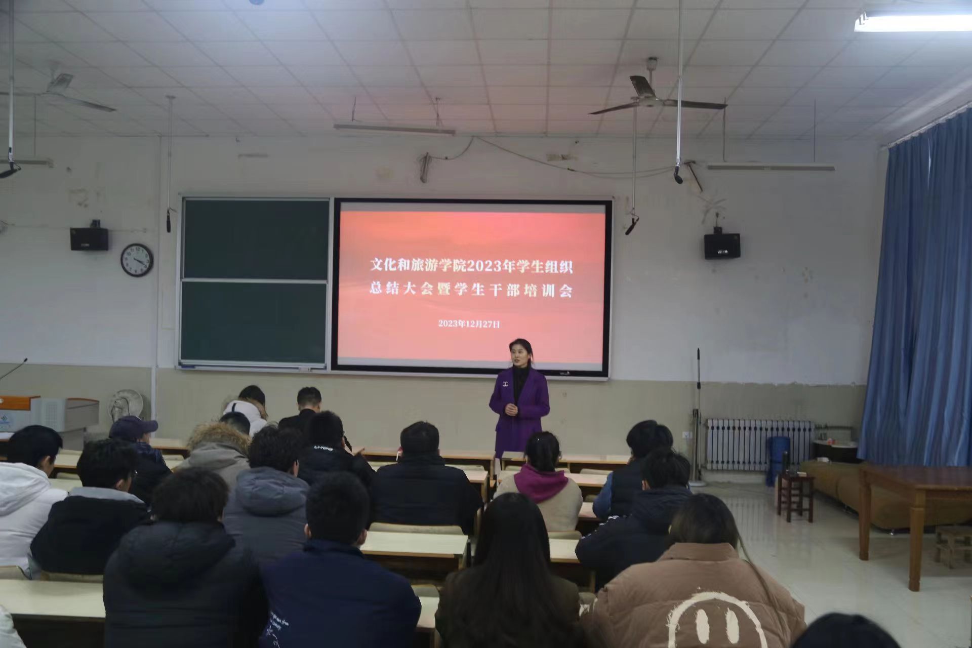 2023年学生组织总结大会暨学生干部培训会在文旅楼阶梯教室顺利举办。本次会议旨在回顾过去一年的工作,总结经验教训,为未来的工作提供借鉴和指导。学院全体学生工作人员及学院学生组织全体学生干部参加了此次会议。