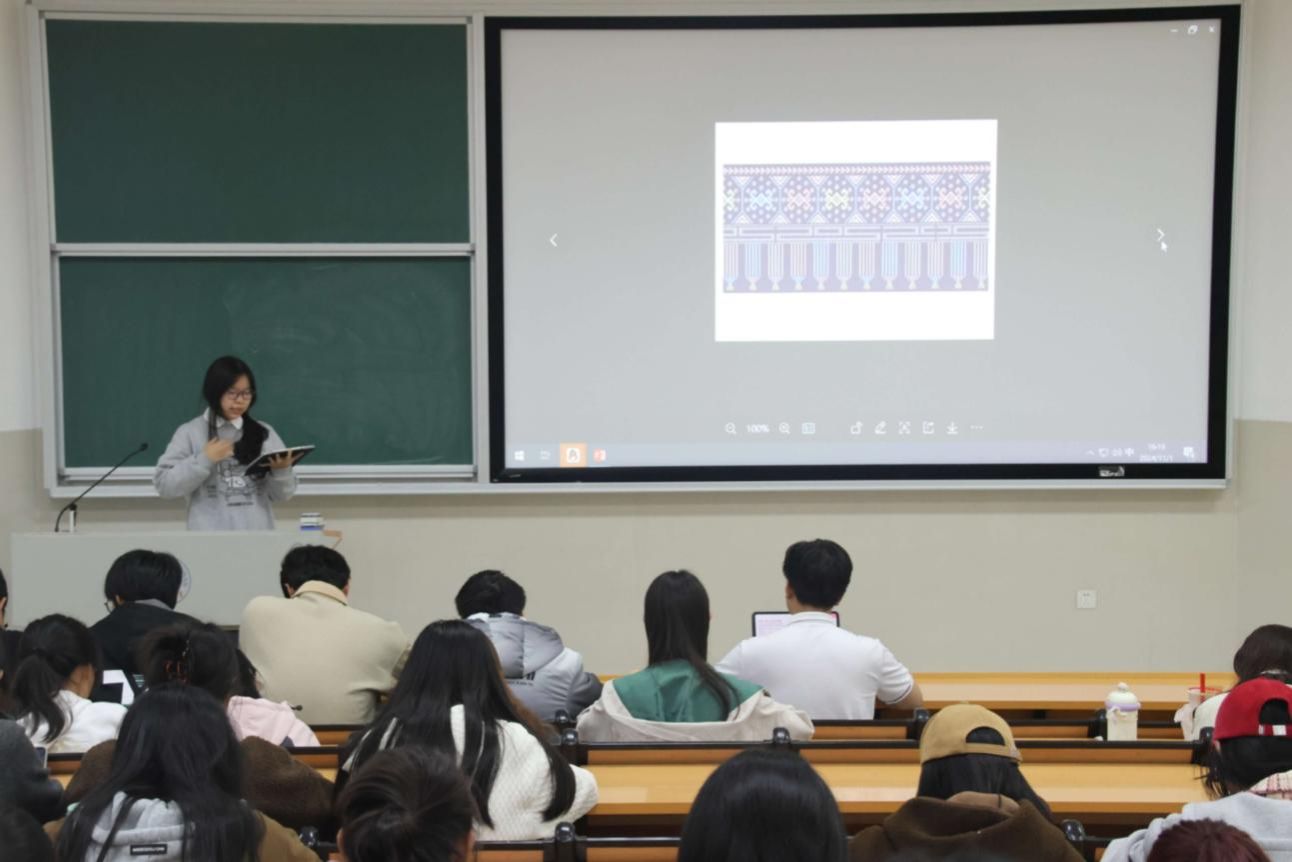 活动开始,同学们认真倾听,积极互动,共同感受不同民族文化的魅力。关爱纯同学以满洲寓意为引,介绍了满族的语言文字,宗教信仰与特色小吃。唐雅慧同学用三视图向我们展示了壮族服饰,织锦与绣球,寓意美满的五色糯米饭。白玛曲珍和次旺吉拉同学介绍了藏族语言与书法,藏袍与藏戏文化,展现了家乡的美丽风景,并简单教授了同学们"有忍耐就没有痛苦,有慈爱就没有敌人"、"你若不努力,谁也给不了你想要的生活"的藏语读法,最后用舞蹈为同学们献上"吉祥如意"的祝福。