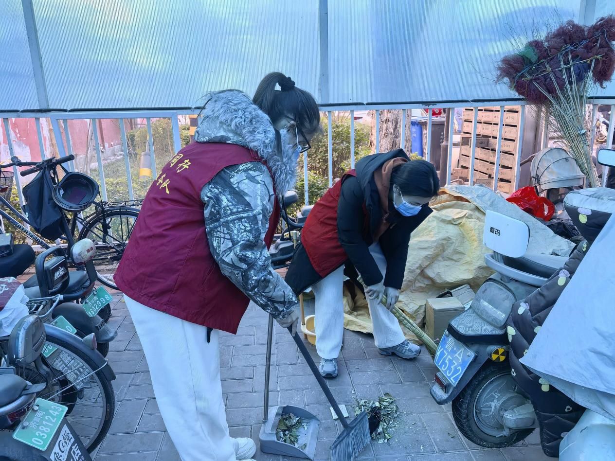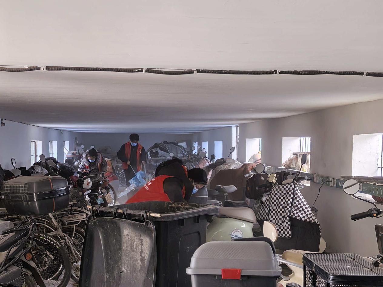 活动现场,志愿者们在社区工作人员的指导下迅速分工、各司其职。在社区车棚区域,志愿者们规范整理车辆停放秩序,细致清扫地面散落的杂物与积存的灰尘,擦拭车棚立柱与设施表面污渍,让原本略显杂乱的车棚变得整洁有序,为居民停车提供了便利。