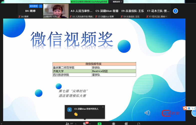 喜报!经过两个月激烈鏖战,12月11日晚,万众瞩目的“尖峰时刻”第七届全国酒店管理模拟大赛胜利落幕,在指导老师蒋婷副教授的带领下,蜂鸟电竞